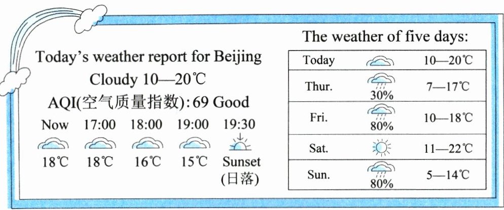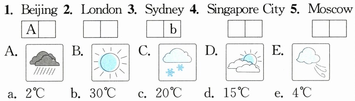 二听两遍录音,在相应城市下方选择合适的天气和温度。(8分)