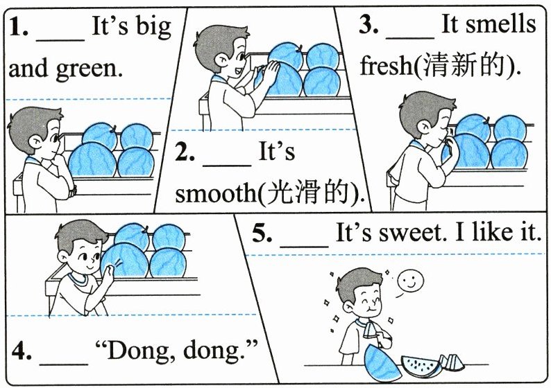 四 新情境 生活运用 如何在超市里挑选出又好又甜的西瓜呢?从方框中选择合适的句子补全下列步骤。(10分)