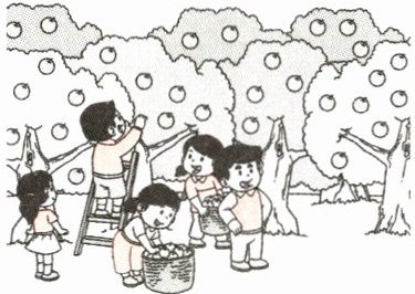 示例:秋天来了,果园里的苹果熟了。伙伴们在果园里开心地摘苹果。