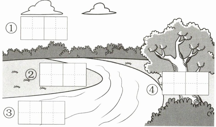 示例:① 白云 ② 草地 ③ 小河 ④ 大树 天上飘着朵朵白云,草地绿油油的,小河边长着一棵大树。