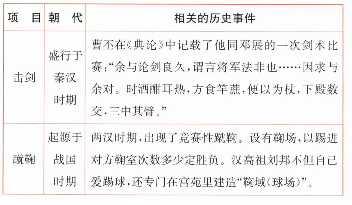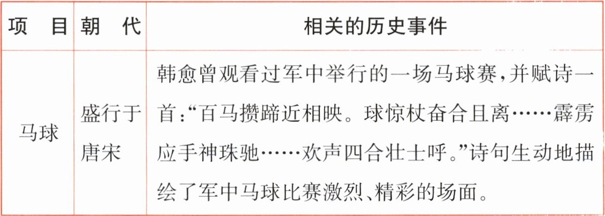 1. ABD 解析:结合材料一可知:六艺包括礼、乐、射、御、书、数。故 A、B、D 都属于纪昌要学习的范畴。 2. 蹴鞠 解析:结合材料二“设有鞠场,以踢进对方鞠室次数多少定胜负”可知这项运动是蹴鞠。 3. 论剑时理念不合 甘蔗 邓展三次被曹丕刺中手臂 解析:本题考查内容理解。阅读材料内容可知文意“我和邓展谈论剑术,谈了很久,说他剑法是不对的……于是邓展要求和我比试。当时酒喝得畅快、情绪高涨,正在吃甘蔗,我们就用甘蔗当兵器,下殿交手了几个回合,(我)三次刺中邓展的手臂”。据此作答即可。 4. 画面:上百匹马的马蹄相互拥挤,彼此几乎近在眼前。球和手杖贴合的一瞬间又立马分离,马球在受击后如神珠般飞驰远去,四周观看的士兵举臂欢呼。感受:我仿佛看到了一场激烈的马球比赛,感受到了体育运动中人们拼搏的激情及观赛人员的欢乐氛围。