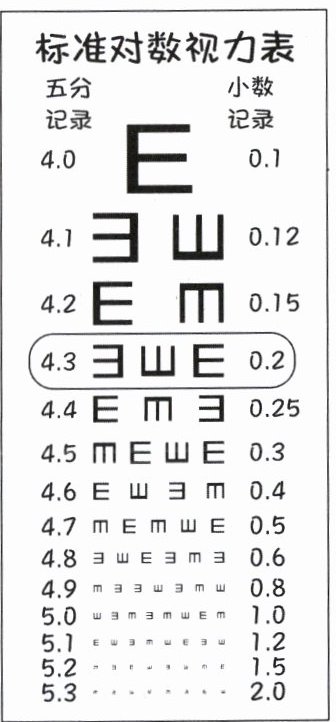 1. [检查视力] 医学上认为视力低于 5.0 为近视,优优只能看清右表标准对数视力表中圈出地方以上部分的“E”,这说明他的眼睛可能已经 。(2 分)