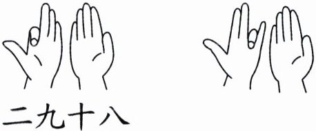 4. 新素养 推理意识 妈妈买了几盒月饼,每盒有 9 个。方方用下面右图的手势计算妈妈一共买了多少个月饼。根据左图的手势意思,猜想方方计算月饼个数时用的口诀是(