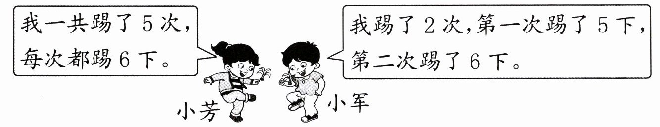 (1)6×5=30(下) 解析:求小芳踢的数量就是求5个6下相加的和是多少,用乘法计算,列式为6×5=30(下)。