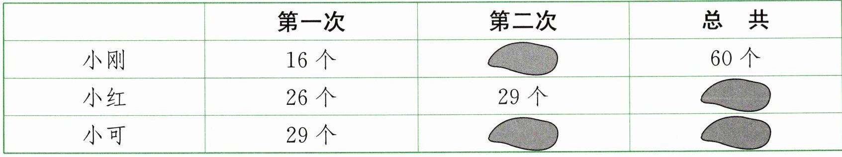 2. 丽丽不小心把踢毽子比赛的成绩弄脏了,三人的成绩各不相同。