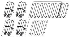 2. 丽丽用摆小棒的方法帮助计算(如右上图),请你在小棒图中先用虚线圈一圈,再用实线圈出与口算过程中 $□$ 里的数对应的部分。