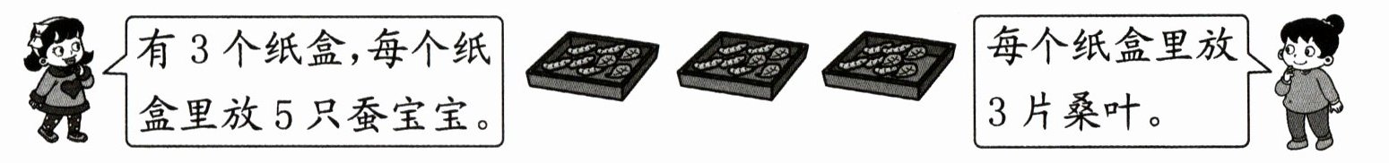 5×3=15(只) 解析:有3个纸盒,每个纸盒里放5只蚕宝宝,求一共放多少只蚕宝宝,就是求3个5只是多少,用乘法计算,列式为5×3=15(只)。本题中的“每个纸盒里放3片桑叶”是多余条件。