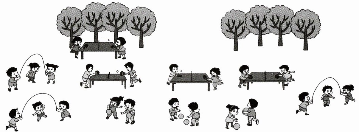 答案不唯一,如(1)一共有多少棵树 4×2=8(棵) (2)一共有多少个小朋友在打乒乓球 2×4=8(个) (3)一共有多少个小朋友在跳绳 3×3=9(个)