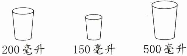 方法不唯一,如200 - 150 = 50(毫升) 200 + 50 = 250(毫升) 解析:先把200毫升的杯子里装满水,倒满150毫升的杯子,这时200毫升的杯子里还剩50毫升的水,再把50毫升的水倒入500毫升的杯子里,然后将200毫升的杯子里倒满水,倒入500毫升的杯子里,此时500毫升的杯子里共有200 + 50 = 250(毫升)水。