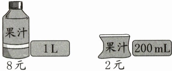 买“瓶装”比较划算 理由:同样1L的果汁,“瓶装”的售价为8元;1L = 1000mL,5个200mL是1L,5袋“袋装”的售价为2×5 = 10(元),8 < 10,所以买“瓶装”比较划算。