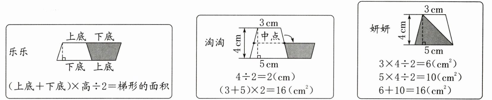 4. 新趋势 评价说明 学习完平行四边形和三角形的面积计算方法后,几名同学尝试计算梯形的面积,以下想法中,(