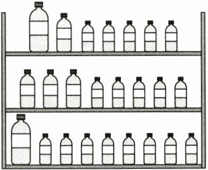4. 如图,商店货架上摆放着大瓶、中瓶、小瓶三种酒,每个小瓶里装酒100毫升,每层货架上酒的总体积相等。每个大瓶里装了(