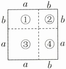 ①的面积=ab,②的面积=$b^{2}$,③的面积=$a^{2}$,④的面积=ab,①+②+③+④=$a^{2}+2ab+b^{2}$,大正方形面积=$(a+b)^{2}$,所以$(a+b)^{2}=a^{2}+2ab+b^{2}$