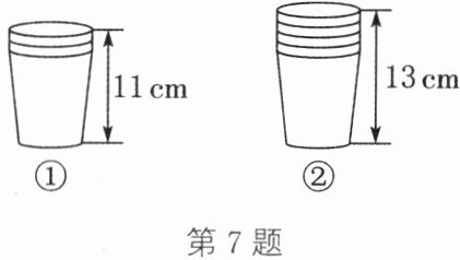 7. (2024·盐城建湖期中)小明在超市买回若干个相同的纸杯,他把纸杯整齐地叠放在一起.如图①,3个纸杯叠放在一起的高度为11 cm;如图②,5个纸杯叠放在一起的高度为13 cm,则把$n$个这样的纸杯叠放在一起的高度为 (