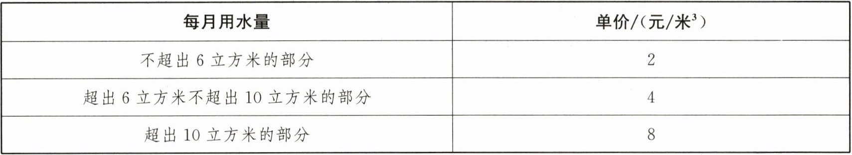 例如:某户居民1月份用水量为8立方米,应缴水费$2×6+4×(8-6)= 20$(元).