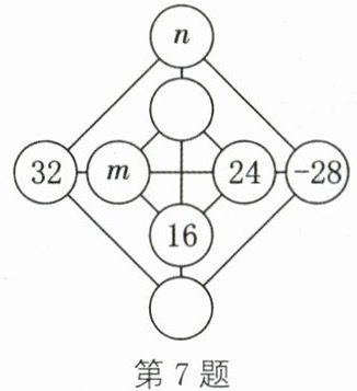 7. 新情境 游戏活动 同学们都熟悉"幻方"游戏,现将"幻方"游戏稍作改进变成"幻圆"游戏.将-4,8,-12,16,-20,24,-28,32分别填入如图所示的圆圈内,使横、竖以及内外两个正方形顶点处圆圈内的4个数之和都相等,则m+n的值为 ( )