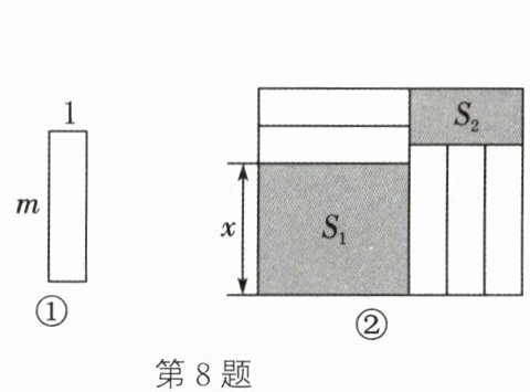 8. 如图①所示的小长方形两条边的长分别为1,m(m>1),现将这样5个大小形状完全相同的小长方形不重叠地放入如图②所示的大长方形中,图中未被覆盖部分用涂色表示,其面积分别为$S_1,S_2.$设面积为$S_1$的长方形一条边为x.若无论x为何值,图中涂色部分$S_1-S_2$的值总保持不变,此时$S_1-S_2$的值为 ( )