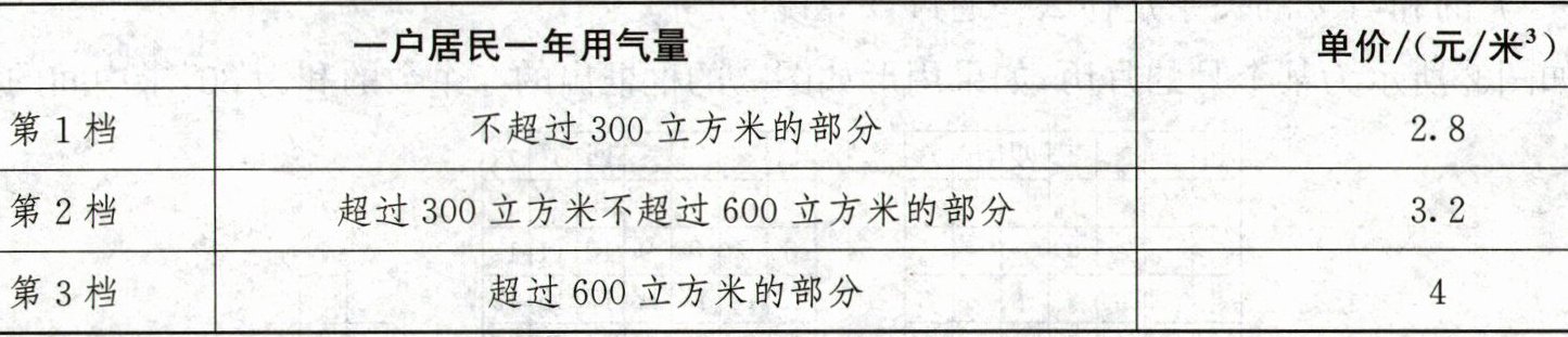 | | 一户居民一年用气量 | 单价/(元/米^3) |