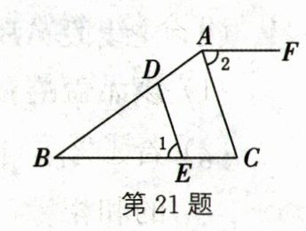 21. (8分)如图,在△ABC中,点D,E分别在AB,BC上,且DE//AC,∠1= ∠2.