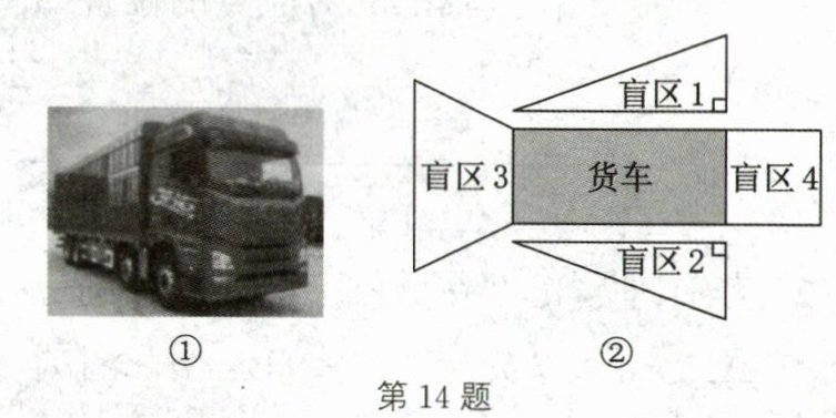 14.(10分)(2024·盐城期末)据调查,很多交通事故和汽车盲区有关,汽车盲区是指驾驶员位于正常驾驶位置时,其视线被车体遮挡而不能直接观察到的那部分区域.在汽车行驶时,若行人、非机动车处于汽车盲区内,极易引发交通事故.