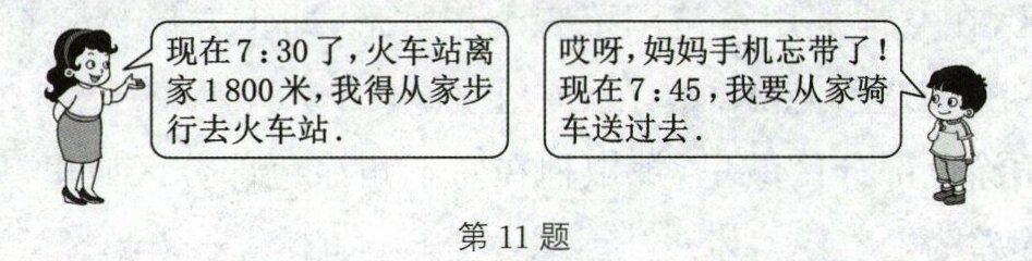 11. (12分)请你根据妈妈和小明的对话内容(如图),列方程解决问题.已知妈妈每分钟步行60米,小明每分钟骑行240米,则小明能在妈妈到达火车站前追上她吗?如果能,何时追上?