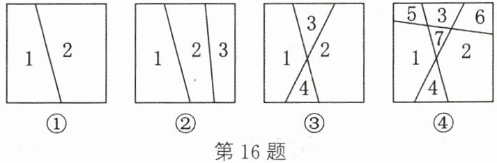16. 小明通过画直线分割正方形,在正方形内画1条直线,该直线将正方形分成2个区域(如图①);在正方形内画2条直线,最少可以分成3个区域(如图②),最多可以分成4个区域且2条直线在正方形内(不含边界)有1个交点(如图③);在正方形内画3条直线,最多可以分成7个区域且3条直线在正方形内(不含边界)有3个交点(如图④).小明又进行了多次试验,其中1次他在正方形内画a条直线,将正方形最多分成b个区域且a条直线在正方形内(不含边界)有c个交点,则a,b,c之间的数量关系为______.
