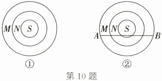 10. (2025·南京建邺一模)如图①,一只圆形平盘被同心圆划成M、N、S三个区域,随机向平盘中撒一把豆子,计算落在M、N、S三个区域的豆子数的比,多次重复这个试验,发现落入三个区域的豆子数的比显示出一定的稳定性,总在三个区域的面积之比附近摆动.如图②,将一根筷子放在该盘中AB位置,发现三个圆弧刚好将AB五等分,我们把豆子落入三个区域的概率分别记作$P(M)$、$P(N)$、$P(S)$.已知$P(S)= \frac {1}{5}$,则$P(M)$的值为____.
