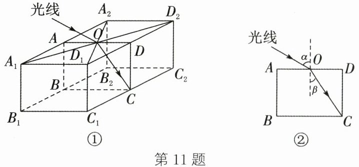 (2) 现有一块与(1)中折射率相同的长方体介质,如图①所示,点$A、B、C、D$分别是长方体棱的中点,若光线经真空从矩形$A_{1}D_{1}D_{2}A_{2}对角线交点O$处射入,其折射光线恰好从点$C$处射出.如图②,$\alpha =60^{\circ }$,$CD= 10\ cm$,求截面$ABCD$的面积.