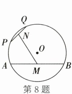 8. 如图,$\odot O$的直径为 26,弦$AB = 24$,动点$P$、$Q在\odot O$上,弦$PQ = 10$.若$M$、$N分别是弦AB$、$PQ$的中点,则线段$MN$长的取值范围是 ( )