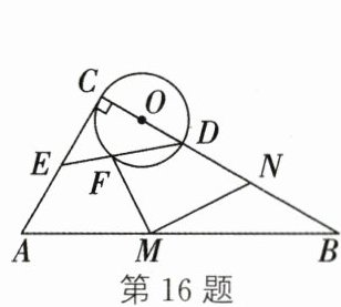 16. 如图,在$\triangle ABC$中,$\angle ACB = 90^{\circ}$,$\angle B = 30^{\circ}$,$AC = 4$,$E是AC$的中点,$M$、$N分别是边AB$、$BC$上的动点,$D也是边BC$上的一个动点,以$CD为直径作\odot O$,连接$ED交\odot O于点F$,连接$FM$、$MN$,则$FM + MN$的最小值为____.