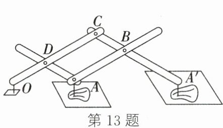13. (2024·无锡惠山段考)一些木工师傅利用平行四边形的不稳定性制作了一种放缩尺,可将图形进行缩放.如图,四边形ABCD为平行四边形,$OD= AD= 1,AB= A'B= 2$,以点O为轴心,在点A处和点$A'$处安装制图笔,当点A处制图笔所画图形的面积为3时,点$A'$处制图笔所画图形的面积是______.