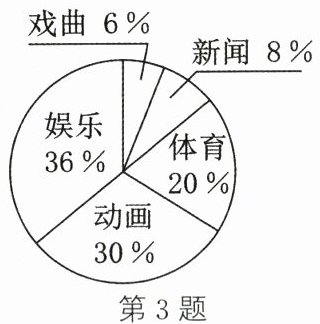 3. (2024·济宁)为了解全班同学对新闻、体育、动画、娱乐、戏曲五类节目的喜爱情况,班主任对全班50名同学进行了问卷调查(每名同学只选其中的一类),依据50份问卷调查结果绘制了全班同学喜爱节目情况扇形统计图(如图).下列说法正确的是 (