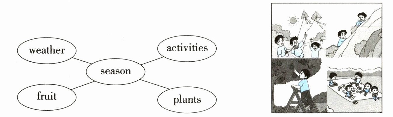 同学们,一年四季各有特色。你最喜欢哪一个呢?请以"My favourite season"为题,根据思维导图和图片提示,写一篇小短文。