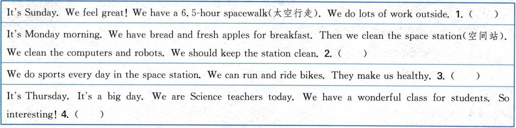 ) || It's Monday morning. We have bread and fresh apples for breakfast. Then we clean the space station(空间站). We clean the computers and robots. We should keep the station clean. 2. (