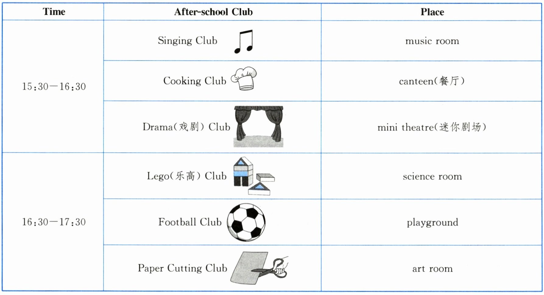 1. There are six. 2. In the art room. 3. He can join the Cooking Club. 4. No, I can't. 5. I like the Singing Club.(本小题答案不唯一$)\n$