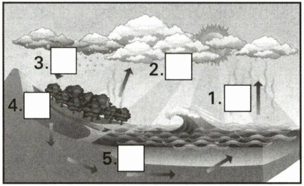 二、跨学科 你知道雨水是从哪里来的吗?这些都和大自然的水循环过程有关。请阅读下面的内容,并将其序号写在对应的方框里,补全水循环的过程。(每小题2分,共10分)