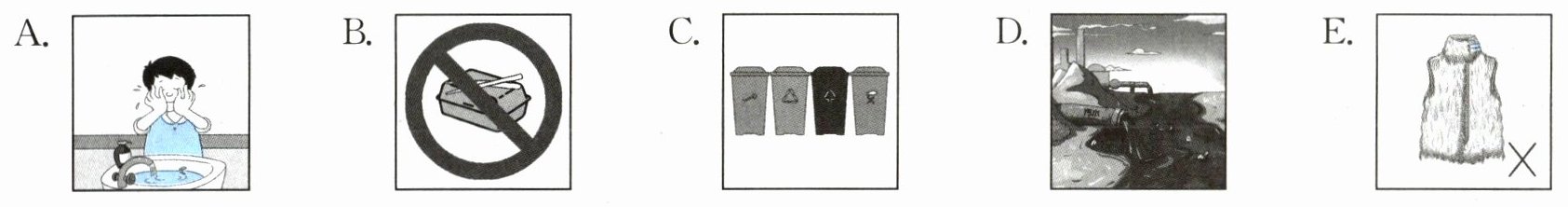 二、周末,学校组织了一场以“环保小卫士,守护地球村”为主题的研学活动,旨在使同学们能够认识到环保的责任,做环保的倡导者和践行者。读一读下面的句子并根据句意选择合适的图片,把图片序号填入相应句子的括号内。(每小题2分,共10分)
