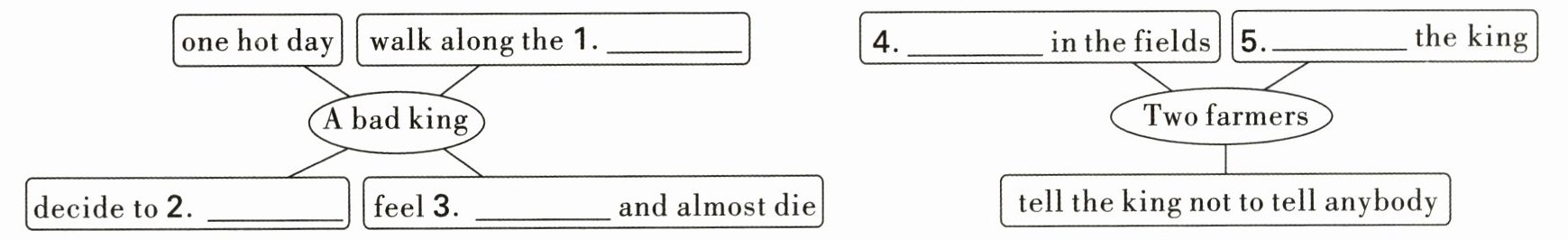 许多年前,有一个很坏的国王,人们都很憎恨他。一天,他下河游泳差点丢了性命……是谁救了他呢?根据故事内容,完成思维导图。(每小题1分,共5分)
