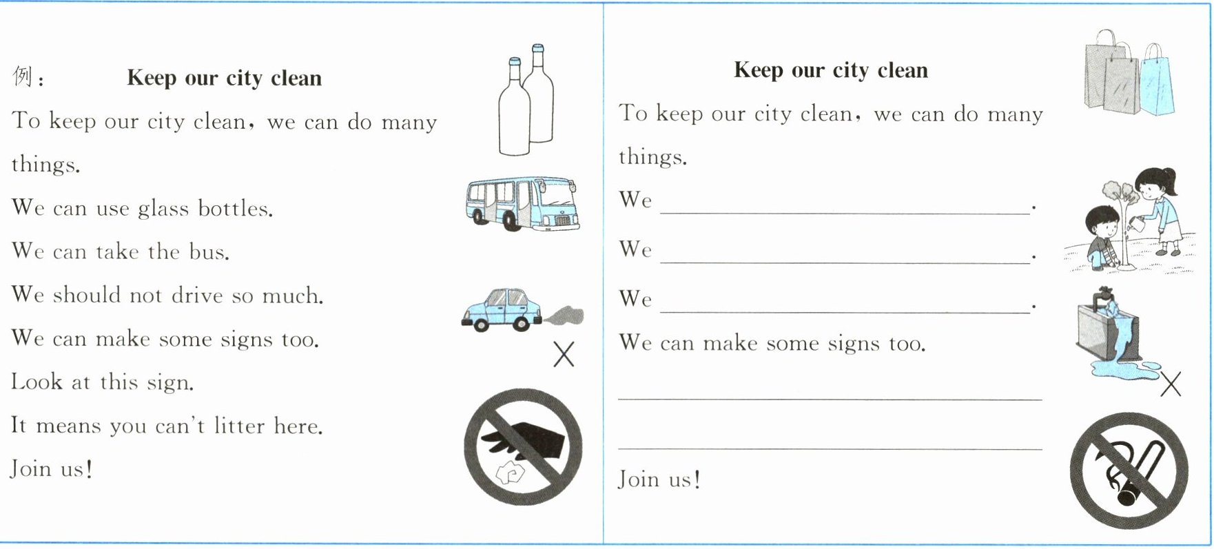 One possible version:Keep our city cleanTo keep our city clean, we can do many things.We can use paper bags.We can plant the trees.We should not waste water.We can make some signs too.Look at this sign.It means you can't smoke here.Join us!