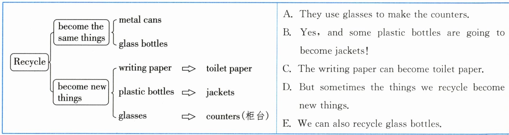 八、新考法 为了保持城市清洁并节约能源,人们正在学习回收利用,你对回收利用了解多少?根据所给思维导图并联系上下文,选择合适的句子补全对话。(每小题2分,共10分)