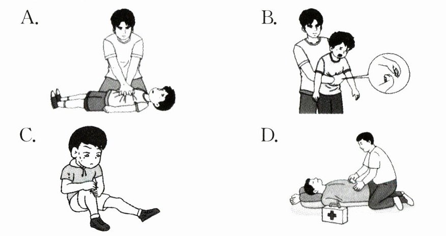 3. B 图片理解题。根据"Stand behind the person and put arms around him or her."可知,一个人被噎住时,要站在这个人的后面,搂住他或她。