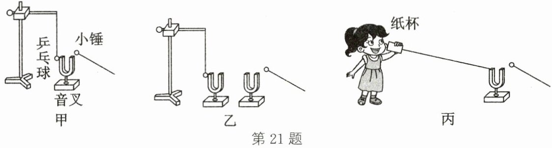 能传播声音。(3)图丙中小华站在离音叉7m远处,小红轻敲音叉后,小华不能听到音叉发出的声音。于是他们将一根7m长的棉线一端扎紧在音叉上,另一端固定在纸杯的中间,并绷紧棉线。小华将纸杯口贴近耳朵,当小红用同样的力再次敲击音叉后,小华能听见比较大的声音,这两次实验对比说明