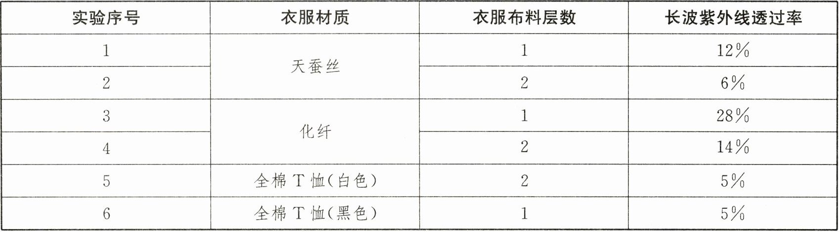| 实验序号 | 衣服材质 | 衣服布料层数 | 长波紫外线透过率 |