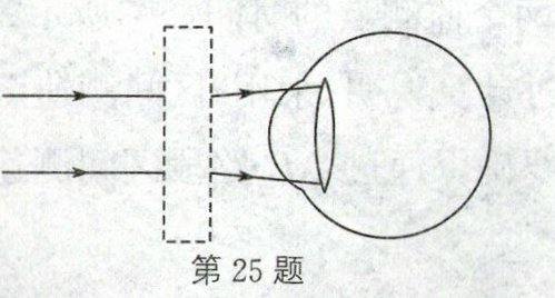 25. (2分)如图是某同学戴眼镜矫正视力的部分光路,请在虚线框内画出矫正视力的透镜,并画出两条光线经晶状体折射后的光线。