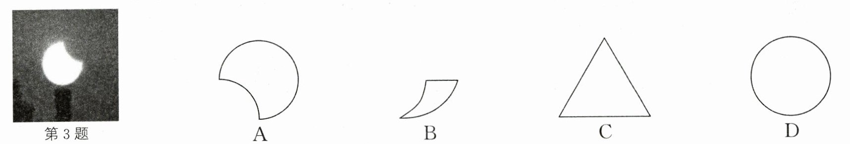 3.(2024·南京雨花台期中)如图所示是摄影爱好者拍摄的日偏食景象。此时,若将太阳光垂直照射在纸板一个很小的“△”孔上,则在地面形成的光斑形状是(