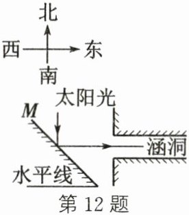 12. (2024·常州金坛期中)如图所示,正午时刻,太阳光垂直于水平地面直射。某工程队为了把太阳光反射到一座洞口朝向正西方向的水平涵洞中去,设计安装了一块能够自动调节方向的平面镜。下列说法错误的是(