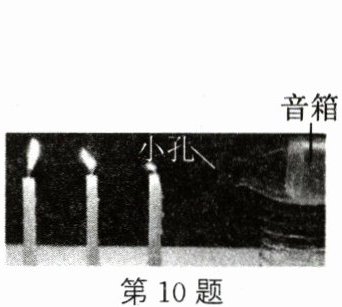 10. (2024·苏州昆山期中)如图是小聪在课外做的小实验:将矿泉水瓶子从中间剪开,将小音箱放在瓶内,在瓶盖上钻一小孔。当音箱播放声音时,看到前方蜡烛的烛焰在晃动。下列有关说法正确的是(