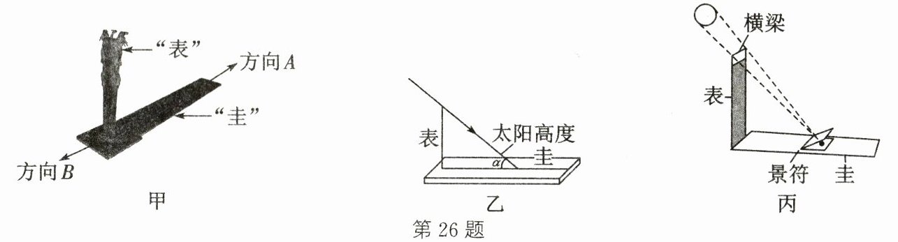 由于光的散射和漫反射等的影响,早期圭表的表影边缘模糊不清,影响测量表影长度的精度。元代天文学家郭守敬对圭表进行改进与创新,他将表的高度增加到原来的五倍,且在表顶加一根架空的横梁,如图丙所示。他还发明了景符,用小孔成像原理可以在圭面上形成太阳和梁的清晰像,把确定表端影的位置变为确定梁影中心的位置,较大提高了测量的精度。