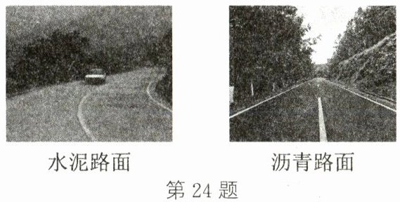 24. (9分)(2024·南通如皋期中)近几年,一些城市道路由从前的水泥路面变成了沥青路面,如图所示。小明发现汽车驶过时产生的噪声比从前小多了,那么汽车行驶的噪声是否与路面的材料有关呢? 下表是小明在网上查到的同一辆轿车在不同路面行驶时噪声的测试数据: