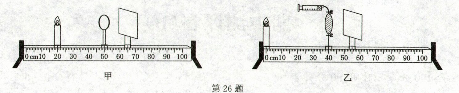 (3)小华继续“模拟探究近视眼的缺陷”实验,他用水袋做成一个水凸透镜来模拟人眼晶状体,并与注射器相连,其凸起程度可通过注射器注水或吸水量来调节。如图乙所示,此时在光屏上得到了烛焰清晰的像,向水凸透镜内